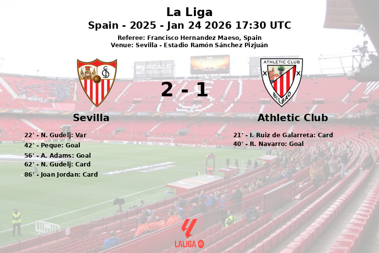 En seconde période, Séville a pris l’avantage grâce à un penalty transformé par A. Adams à la 56e minute. L’Athletic Club a cherché l’égalisation avec insistance, mais la défense sévillane est restée solide jusqu’à la fin. Le match a également été marqué par des cartons jaunes, avec N. Gudelj et Joan Jordan avertis pour Séville.