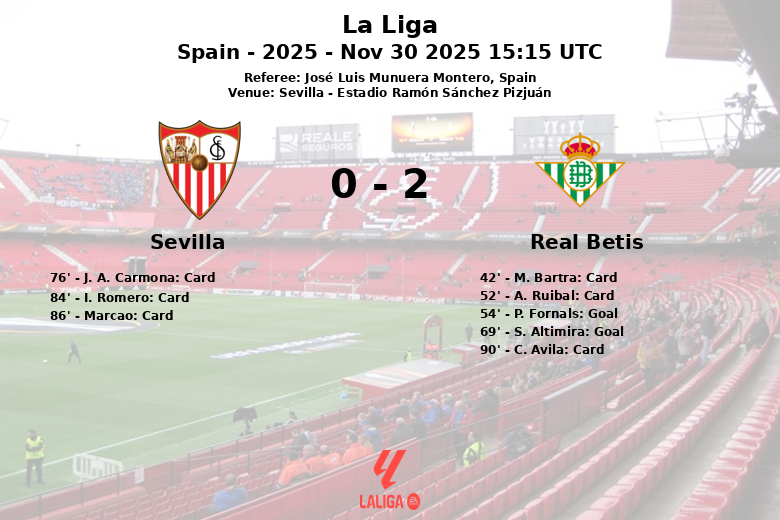 De son côté, le Real Betis a saisi ses chances. Avec trente-cinq pour cent de possession, les Verts et Blancs ont été plus efficaces devant le but. Pablo Fornals a ouvert le score à la cinquante-quatrième minute avec un but, et Sergio Altimira a scellé le match à la soixante-neuvième minute, après le deuxième but. Malgré avoir commis plus de fautes que son rival (vingt-deux), le Betis a gardé son sang-froid et a ramené les trois points à la maison. L’arbitre José Luis Munuera Montero a montré trois cartons jaunes aux joueurs du Betis, dans un match marqué par l’intensité. Le match, correspondant à la quatorzième journée de la Liga, saison deux mille vingt-cinq, a laissé Betis avec le sourire et Séville avec beaucoup à réfléchir.
