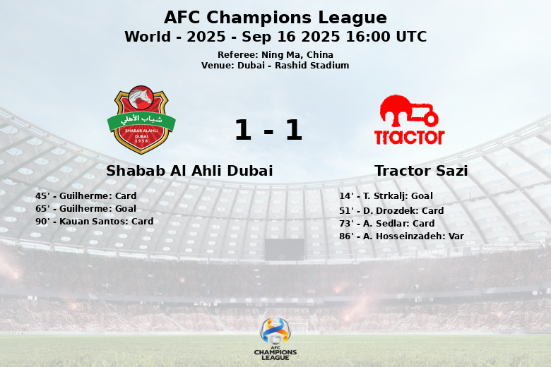 Dubaï, 16 septembre 2025 – Le stade Rashid a été le théâtre d’un match intense entre Shabab Al Ahli Dubaï et Tractor Sazi, comptant pour la Ligue des Champions de l’AFC. Le match s’est soldé par un nul, mais non sans avoir offert de nombreuses émotions aux supporters.