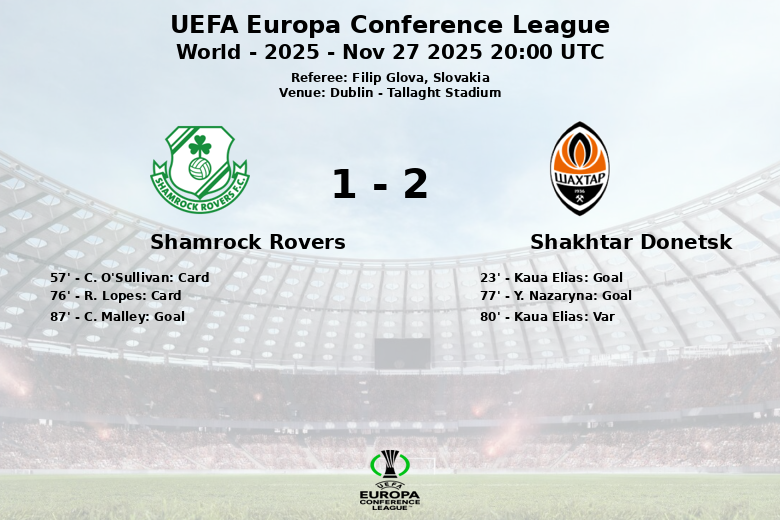 Le Shakhtar a pris l’avantage à la 23e minute grâce à un but de Kaua Elias, sur une passe décisive de V. Tobias. L’avantage a duré jusqu’à la 77e minute, lorsque Y. Nazaryna a étendu l’avance du Shakhtar. Cependant, les Shamrock Rovers ont fait preuve de résilience, et à la 87e minute, C. Malley a marqué sur une passe décisive de G. Burke. Le Shakhtar avait auparavant célébré un autre but, mais la VAR a annulé le but de Kaua Elias à la 80e minute pour cause de hors-jeu. Malgré la domination ukrainienne et les multiples occasions créées, le match s’est terminé sur un match nul, reflétant l’esprit combatif de l’équipe irlandaise. L’arbitre Filip Glova a distribué deux cartons jaunes, tous deux à des joueurs des Shamrock Rovers, C. O’Sullivan et R. Lopes.