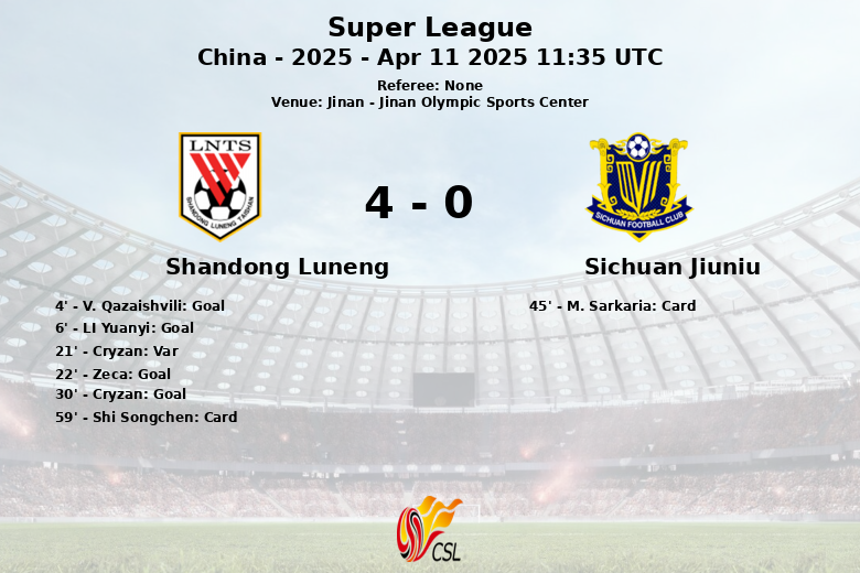 Le Shandong Luneng a remporté une victoire éclatante 4-0 contre le Sichuan Jiuniu lors de la 6ème journée de la Super League chinoise 2025, au Jinan Olympic Sports Center de Jinan. Le match, joué le 11 avril à 11h35, a été marqué par la domination du club local, qui a contrôlé 59% de la possession et créé de nombreuses occasions de but.