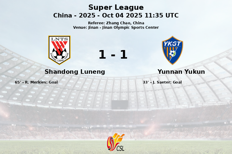 Jinan, Chine – Dans un match disputé au Jinan Olympic Sports Center, Shandong Luneng et Yunnan Yukun ont fait match nul, tenant les supporters en haleine. Le match, comptant pour la 26e journée de la Super League chinoise, a été arbitré par Zhang Chao.