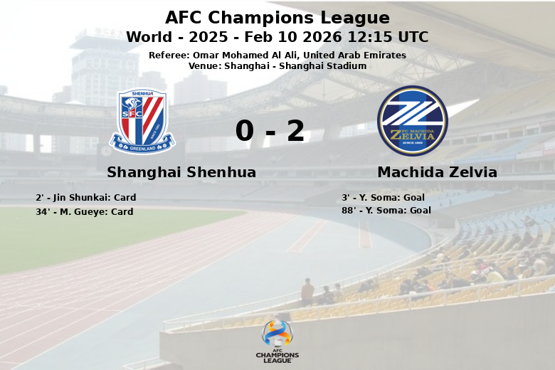 Le Shanghai Shenhua a généré 13 tirs, dont 4 cadrés, mais n’a pas réussi à battre le gardien de but adverse. De son côté, Machida Zelvia, avec moins de tirs (9), a mieux exploité ses occasions. La discipline tactique de Machida Zelvia a contrasté avec les deux cartons jaunes reçus par le Shanghai Shenhua (Jin Shunkai à la 2ème minute et M. Gueye à la 34ème minute). Le match a été scellé à la 88ème minute par un autre but de Y. Soma, cette fois de jeu, assisté par K. Kuwayama. Avec ce résultat, Machida Zelvia engrange des points précieux dans son parcours en AFC Champions League.