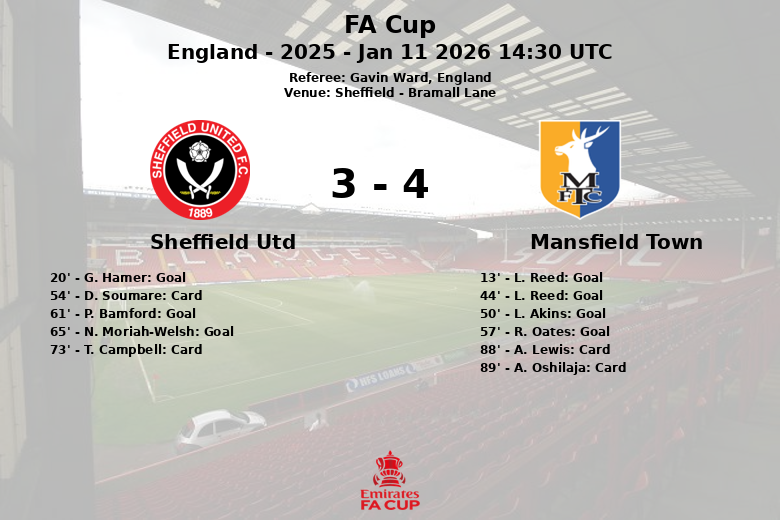En seconde période, Mansfield Town est revenu avec force, augmentant son avance grâce à des buts de L. Akins à la 50e minute et de R. Oates à la 57e minute. Sheffield Utd a tenté de revenir au score, marquant par l’intermédiaire de P. Bamford à la 61e minute et grâce à un but contre son camp de N. Moriah-Welsh à la 65e minute.