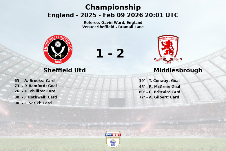 Le match, arbitré par Gavin Ward, a été caractérisé par un nombre élevé d’avertissements. Sheffield United a reçu trois cartons jaunes (A. Brooks, K. Phillips, F. Seriki) et un carton rouge. Middlesbrough a vu deux cartons jaunes (C. Brittain, A. Gilbert). Finalement, Middlesbrough a empoché les trois points après un match disputé à Bramall Lane.
