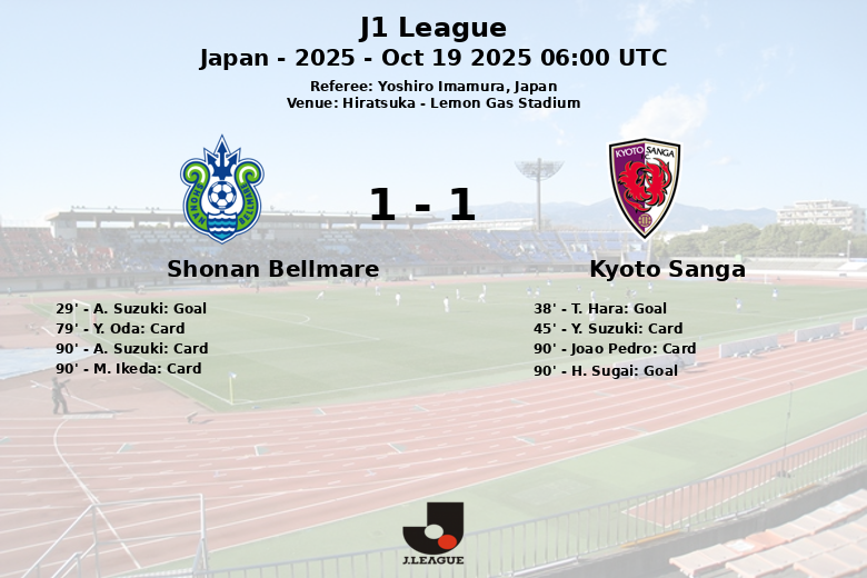 Shonan Bellmare a pris l’avantage à la 29e minute grâce à un but de A. Suzuki, sur une passe décisive de S. Nakano. Cependant, Kyoto Sanga a réagi et T. Hara a égalisé à la 38e minute, après avoir manqué un penalty et profité du rebond. Le match a pris une tournure dramatique juste avant la pause, avec l’expulsion de Y. Suzuki de Kyoto Sanga à la 45e minute.