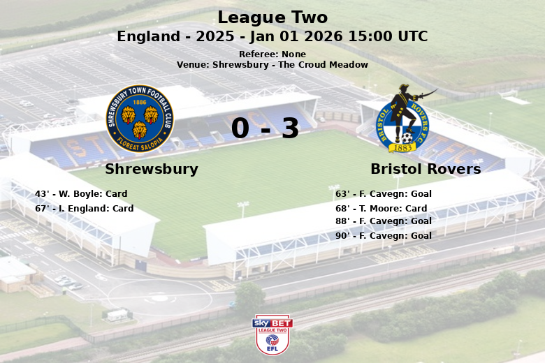 Shrewsbury, Angleterre – Dans un match disputé à The Croud Meadow, Bristol Rovers a remporté une victoire retentissante sur Shrewsbury, grâce à une performance exceptionnelle de F. Cavegn, qui a marqué un triplé. Le match, correspondant à la 24e journée de League Two, saison 2025, a été caractérisé par une domination du ballon de Bristol Rovers (57 % de possession) par rapport aux 43 % de Shrewsbury.