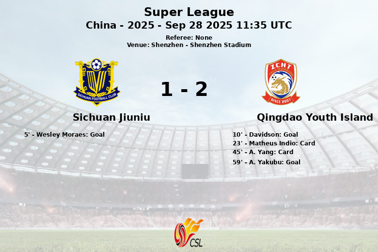 Shenzhen, Chine – Un match disputé au Shenzhen Stadium a vu Qingdao Youth Island remporter la victoire face à Sichuan Jiuniu. Malgré un début prometteur pour Sichuan Jiuniu avec un but rapide de Wesley Moraes à la 5e minute, Qingdao Youth Island a rapidement réagi. Davidson a égalisé à la 10e minute. La possession de balle a favorisé Qingdao Youth Island avec 62 %, tandis que Sichuan Jiuniu en a détenu 38 %. Qingdao Youth Island a pris l’avantage à la 59e minute avec un but sur penalty transformé par A. Yakubu. Le match, comptant pour la 26e journée de la Super League, a été marqué par l’intensité et les défis, comme en témoigne le nombre de fautes commises par les deux équipes (20 pour Sichuan Jiuniu et 19 pour Qingdao Youth Island). Qingdao Youth Island a reçu deux cartons jaunes au cours du match, tandis que Sichuan Jiuniu n’a reçu aucun avertissement. En termes de tirs, Sichuan Jiuniu a tenté 13 tirs, dont 4 cadrés, tandis que Qingdao Youth Island a eu 10 tentatives, également avec 4 dirigés vers le but.