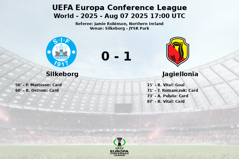 Silkeborg, 7 août 2025 – Silkeborg et Jagiellonia ont fait match nul lors d’une rencontre comptant pour le troisième tour de qualification de la Ligue Europa Conférence de l’UEFA, qui s’est déroulée au JYSK Park. Le match, arbitré par le Nord-Irlandais Jamie Robinson, a été marqué par son intensité et sa lutte au milieu de terrain.