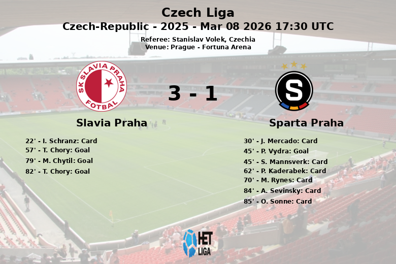 Prague, République tchèque – Dans un derby électrisant disputé à la Fortuna Arena, le Slavia Praha a battu le Sparta Praha avec une démonstration de force en seconde période. Le match, comptant pour la 25e journée de la Liga tchèque, a été marqué par l’intensité et de nombreux avertissements.