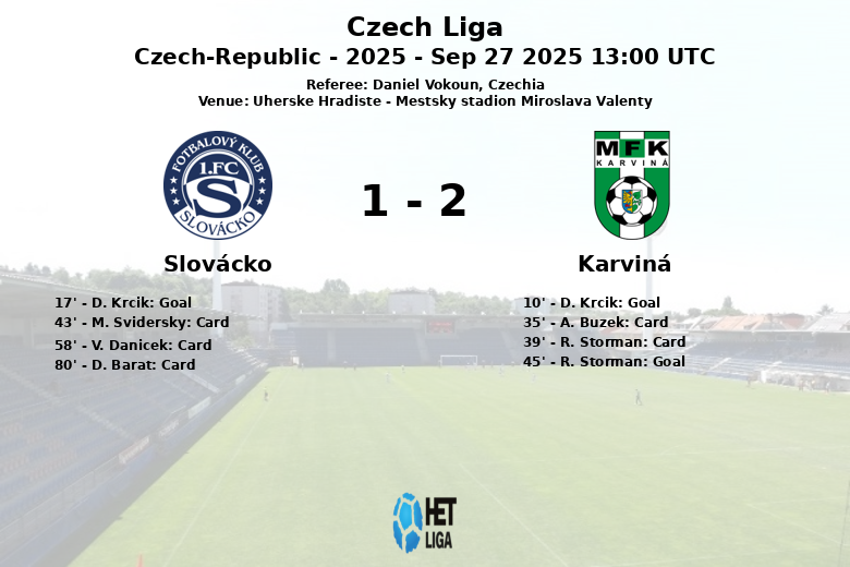 Uherske Hradiste, République tchèque – Dans un match âprement disputé au Mestsky stadion Miroslava Valenty, Karviná a remporté la victoire contre Slovácko dans une rencontre riche en actions et en controverses. Le match, comptant pour la dixième journée de la Ligue tchèque lors de la saison 2025, a été marqué par des buts, des cartons et un carton rouge qui a considérablement influencé le cours du jeu.