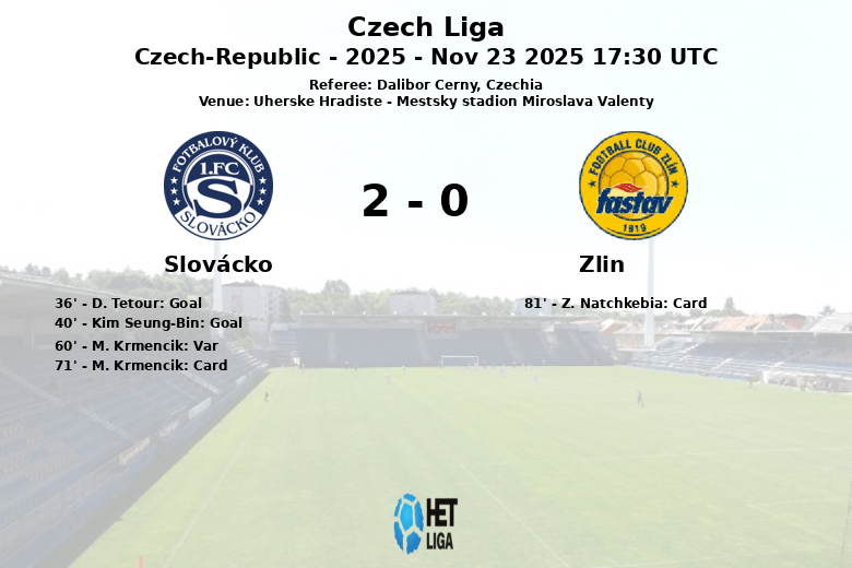 Remplacements dans l’quipe de slovácko: À la 65e minute, M. Rundic est entré et A. Stojcevski est sorti., À la 65e minute, Kim Seung-Bin est entré et M. Svidersky est sorti., À la 76e minute, P. Reinberk est entré et G. Ndefe est sorti., À la 84e minute, D. Tetour est entré et M. Koscelnik est sorti., À la 84e minute, M. Krmencik est entré et D. Barat est sorti.