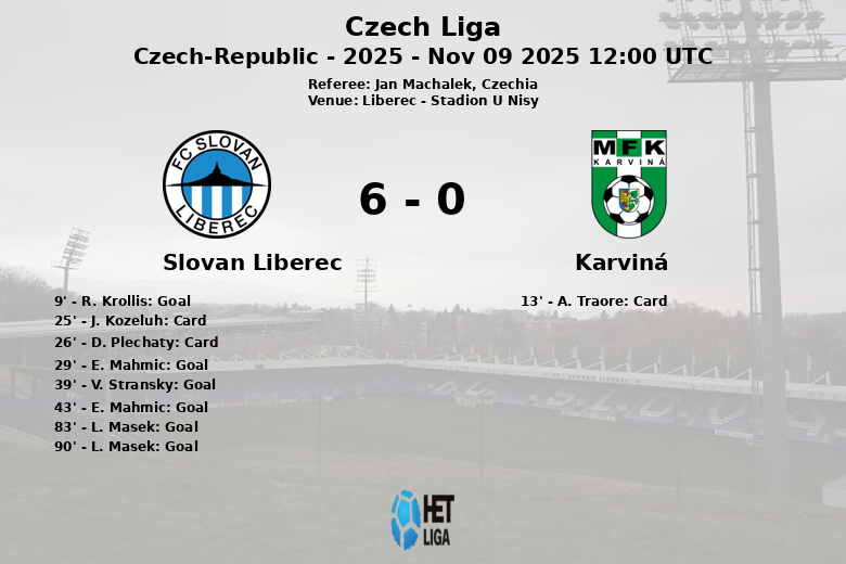 Remplacements dans l’quipe de slovan liberec: À la 16e minute, A. Kayondo est entré et J. Kozeluh est sorti., À la 46e minute, E. Mahmic est entré et L. Masek est sorti., À la 59e minute, R. Krollis est entré et L. Letenay est sorti., À la 59e minute, A. Soliu est entré et P. Hodous est sorti., À la 68e minute, P. Dulay est entré et D. Rus est sorti., À la 68e minute, T. Diakite est entré et M. Hlavaty est sorti.