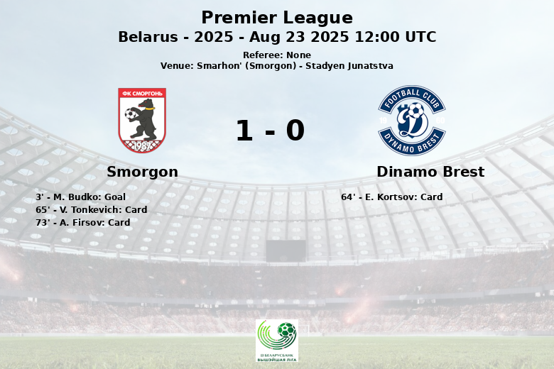 Smarhon’ (Smorgon), Biélorussie – Lors d’un match correspondant à la 19e journée de la Premier League biélorusse, Smorgon a remporté une victoire importante contre le Dinamo Brest au Stadyen Junatstva. Le match, disputé le 23 août 2025, a connu un début fulgurant pour l’équipe locale, avec un but rapide de M. Budko à la 3e minute.