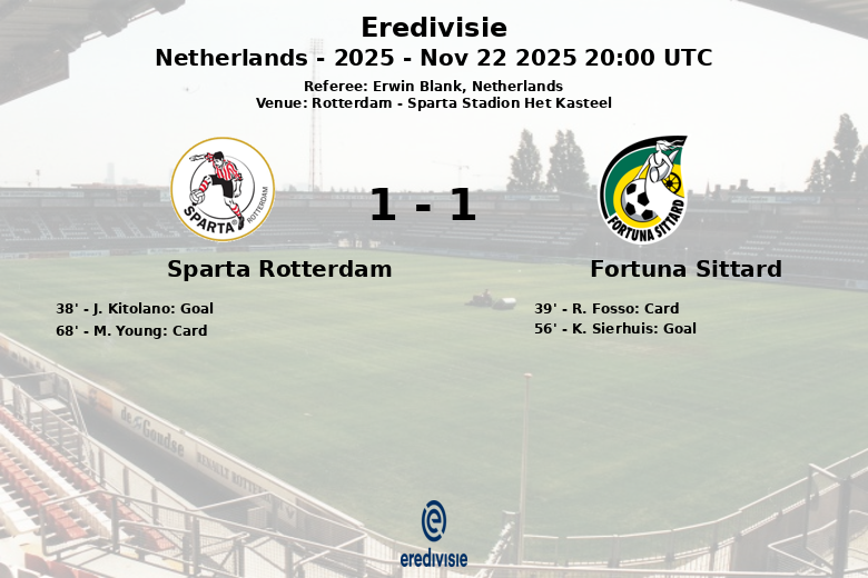 Le premier but du match est intervenu à la 38e minute, lorsque J. Kitolano du Sparta Rotterdam a trouvé le chemin des filets, grâce à une passe décisive de M. van Bergen. La joie locale, cependant, a été tempérée par l’égalisation du Fortuna Sittard à la 56e minute, grâce à K. Sierhuis.