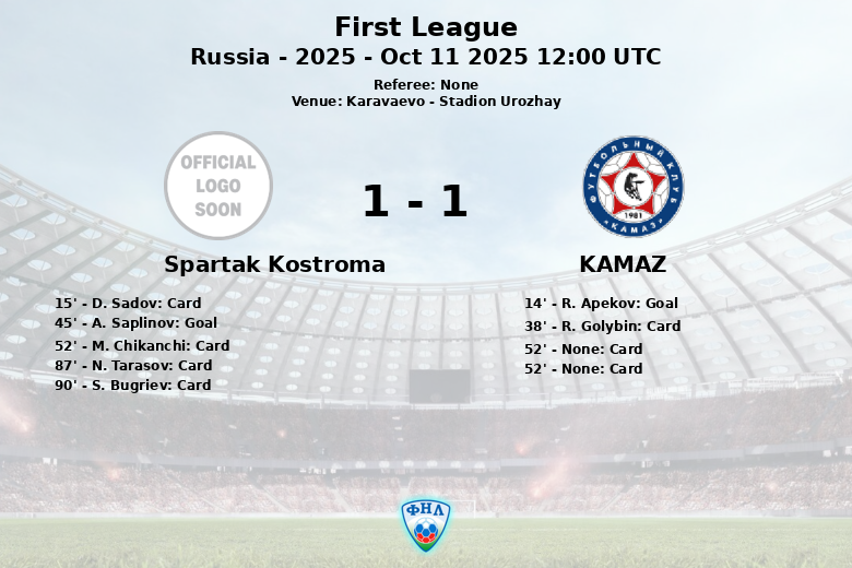 Le KAMAZ a pris l’avantage à la 14e minute grâce à un but de R. Apekov, qui a profité d’une passe décisive pour battre le gardien adverse. Cependant, la joie des locaux a été tempérée lorsque D. Sadov du Spartak Kostroma a reçu un carton jaune à la 15e minute, marquant le début d’un match intense sur le plan disciplinaire. R. Golybin de KAMAZ a également été averti à la 38e minute.