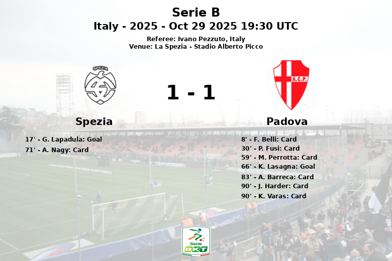 La Spezia, Italie – Un match disputé au Stadio Alberto Picco s’est terminé par un match nul 1-1 entre Spezia et Padova lors de la dixième journée de Serie B. Le match, joué le 29 octobre 2025, a été marqué par l’intensité et un nombre élevé de cartons jaunes, avec neuf distribués au total.