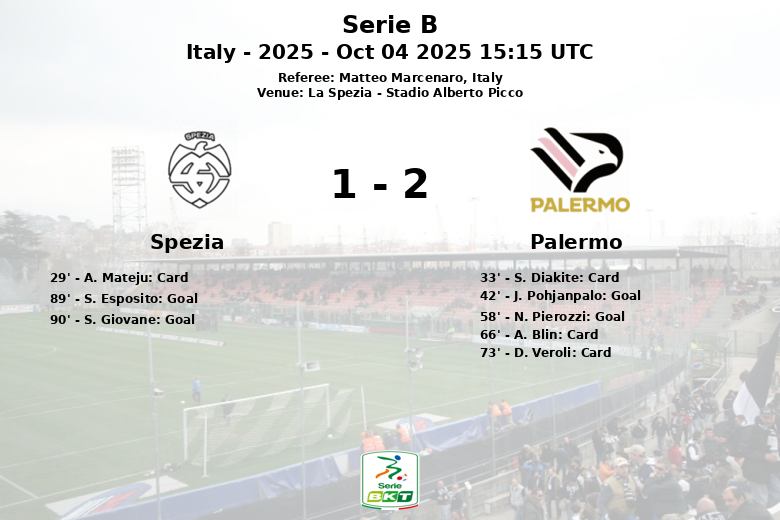 Le match a été marqué par l’intensité et de nombreuses fautes, reflétées par les cartons jaunes infligés à A. Mateju (Spezia) et à S. Diakite, A. Blin et D. Veroli (Palerme). Bien que les deux équipes aient eu 10 tirs, Palerme a fait preuve d’une plus grande efficacité devant le but, avec 3 tirs cadrés contre 5 pour Spezia. À la fin, le match s’est terminé 2-2.