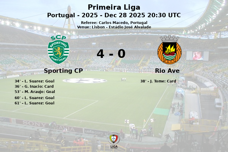 Le premier but du Sporting CP est intervenu à la 34e minute grâce à L. Suarez, qui a profité d’une excellente passe décisive de J. Simoes. Cependant, l’élan du match a été momentanément interrompu par un carton jaune pour G. Inacio du Sporting CP à la 36e minute et un autre pour J. Tome de Rio Ave à la 38e.