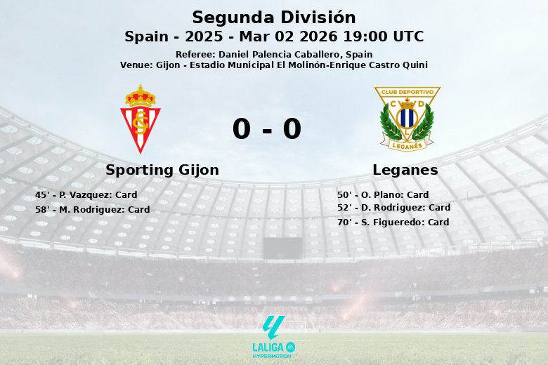 Le match, correspondant à la 28e journée de la Segunda División, a vu les deux équipes se battre férocement pour le contrôle du milieu de terrain. Le Sporting Gijón a dominé la possession avec 50 %, essayant de se créer des occasions avec 12 tirs, dont seulement 4 cadrés. Leganés, de son côté, s’est montré plus conservateur en attaque, enregistrant 6 tirs, dont aucun n’était cadré.
