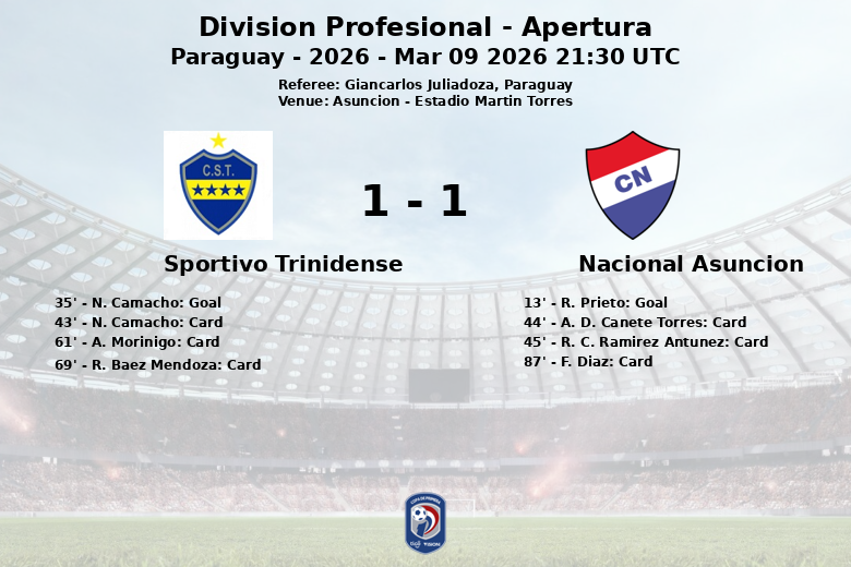 Dans un match disputé à l’Estadio Martín Torres d’Asunción, Nacional et Sportivo Trinidense ont fait match nul, une rencontre marquée par plusieurs avertissements. Nacional Asunción a pris l’avantage dès la 13e minute grâce à un but de R. Prieto, sur une passe décisive de A. D. Cañete Torres. Cependant, Sportivo Trinidense a répondu à la 35e minute avec un but de N. Camacho, sur une passe décisive de R. Báez Mendoza, égalisant le score avant la mi-temps.