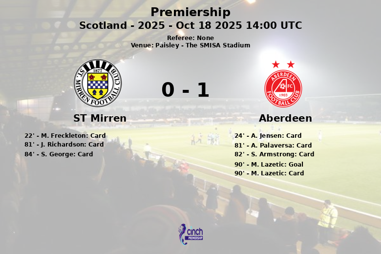 Alors que tout semblait indiquer que St. Mirren allait s’assurer la victoire, M. Lazetic d’Aberdeen a marqué un but à la 90e minute, égalisant le score. Lazetic a été immédiatement averti après pour sa célébration.