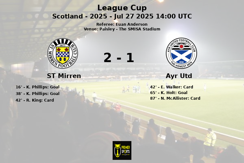 Paisley, Écosse – Lors d’un match correspondant à la phase de groupes de la League Cup, ST Mirren a surmonté Ayr Utd au The SMISA Stadium. K. Phillips a été la figure marquante de ST Mirren, marquant deux buts aux 16e et 38e minutes, tous deux assistés par R. Idowu, donnant à son équipe une avance confortable en première mi-temps.