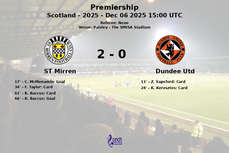 Paisley, Écosse – Le ST Mirren a battu Dundee United au The SMISA Stadium sur le score de 2 à 0, lors d’un match comptant pour la 16e journée de la Premiership écossaise. Le match, disputé le 6 décembre 2025, a été marqué par de nombreux cartons jaunes, reflétant l’intensité avec laquelle les deux équipes ont disputé chaque ballon.