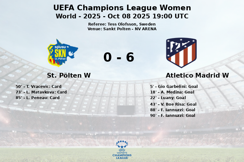 Sankt Polten, le 8 octobre 2025 – L’Atlético de Madrid Féminin a démontré sa supériorité à la NV ARENA, en écrasant le St. Pölten avec un score final de six à zéro lors de son premier match de la phase de groupes de la Ligue des Champions Féminine de l’UEFA. Dès le début, l’équipe espagnole a imposé son rythme et sa maîtrise du ballon, reflétés par une possession de balle de 61%.