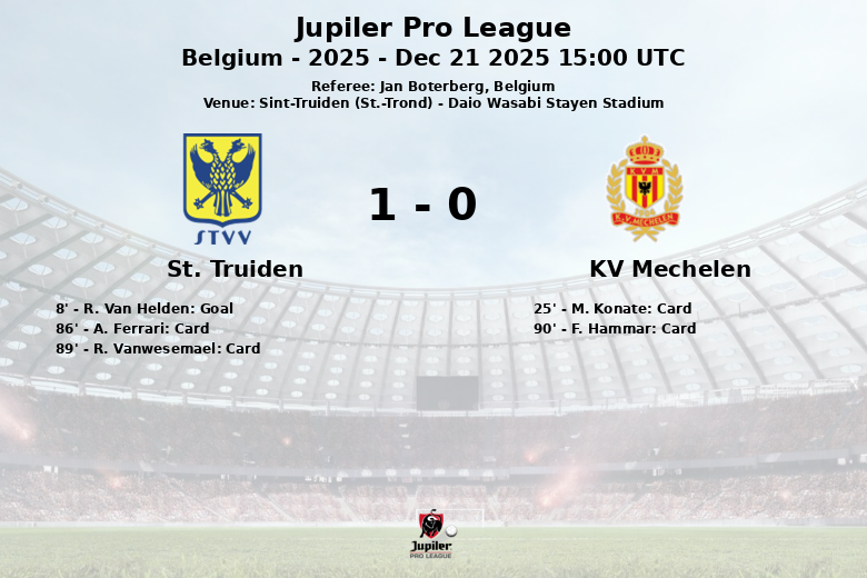 La différence au tableau d’affichage a été faite par un but précoce de R. Van Helden à la 8e minute, suite à une passe décisive de K. Goto. Malgré les tentatives du KV Mechelen pour égaliser, avec 10 tirs au total (2 cadrés et 6 non cadrés) contre 9 pour Saint-Trond (5 cadrés et 2 non cadrés), la défense locale s’est montrée solide.