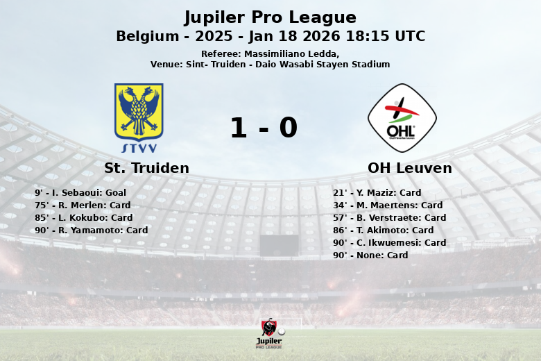 Saint-Trond, Belgique – Dans un match chargé de tension et de cartons, le St. Truiden a réussi à s’imposer face à OH Leuven dans son stade, le Daio Wasabi Stayen Stadium, lors de la 21e journée de la Jupiler Pro League. Le but solitaire d’I. Sebaoui à la 9e minute, suite à une action bien construite, a suffi à faire pencher la balance en faveur des locaux.