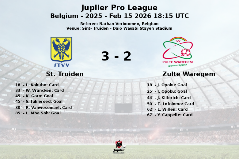 Saint-Trond, Belgique – Un match plein d’émotions et de controverses s’est déroulé au Daio Wasabi Stayen Stadium, où Saint-Trond et Zulte Waregem ont fait match nul lors d’un match correspondant à la 25e journée de la Jupiler Pro League. Le match, joué le 15 février 2026, sous l’arbitrage de Nathan Verboomen, a été marqué par des buts, des cartons et une expulsion qui ont influencé le déroulement du jeu.