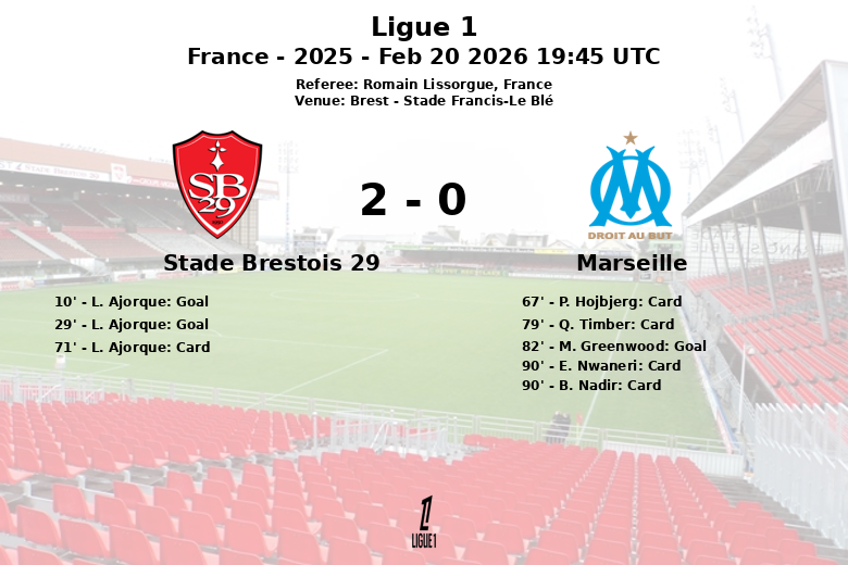Brest, France – Le Stade Brestois 29 a remporté une victoire retentissante à domicile contre Marseille au Stade Francis-Le Blé. Le match, disputé lors de la 23e journée de Ligue 1, a vu une domination initiale de Brest, qui s’est traduite par une avance précoce grâce à un doublé de L. Ajorque. Le premier but est arrivé à la 10e minute, suivi d’un autre à la 29e minute, tous deux issus d’actions bien construites.