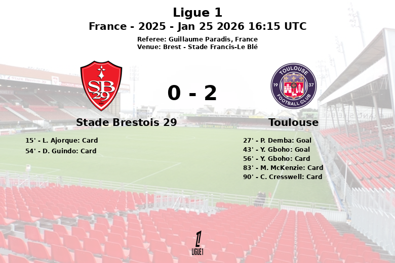 Stade Brestois 29 vs Toulouse Jan 25 2026 16:15 UTC