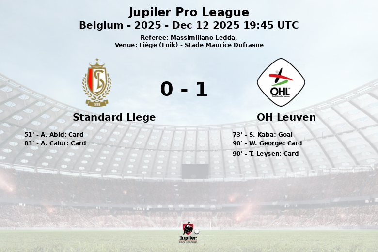 Liège (Luik), Belgique – Lors d’un match correspondant à la 18e journée de la Jupiler Pro League, l’OH Leuven s’est imposé face au Standard de Liège au Stade Maurice Dufrasne. Le match, arbitré par Massimiliano Ledda, a été marqué par son intensité et ses nombreuses interruptions.