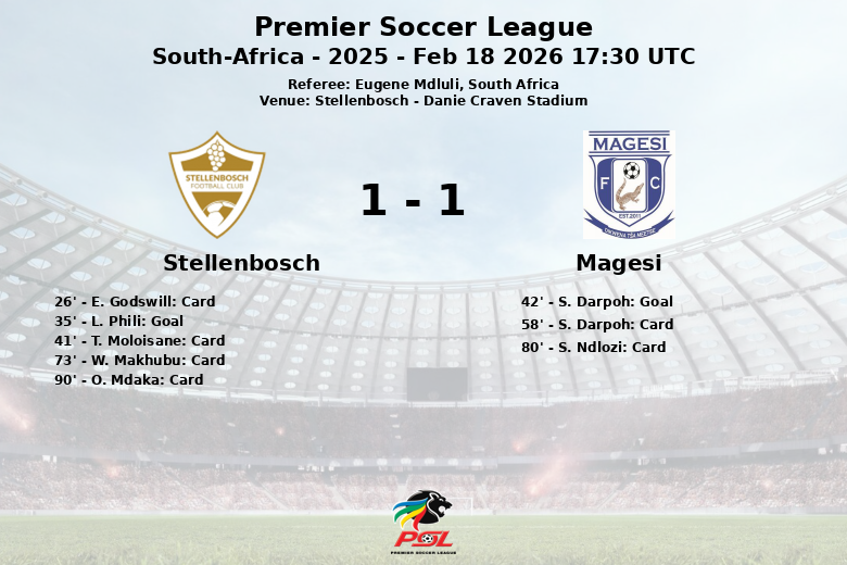 Stellenbosch, Afrique du Sud – Dans un match acharné au Danie Craven Stadium, Stellenbosch et Magesi ont fait match nul, dans une rencontre pleine d’émotions et de jeux controversés. Le match, comptant pour la 17e journée de la Premier Soccer League, a tenu les supporters en haleine.