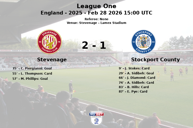 En seconde période, Stevenage a pris l’avantage à la 57e minute grâce à un but de M. Phillips, servi par J. Reid. Le match a été marqué par un jeu physique, avec un total de 25 fautes commises par les deux équipes. Stockport County a écopé de cinq cartons jaunes, tandis que Stevenage en a reçu un. Malgré plus de corners (7 contre 2) et une possession plus importante, Stockport County n’a pas pu renverser le résultat.