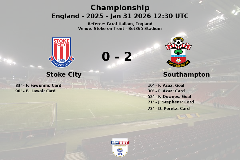 Stoke City, malgré un léger avantage en termes de possession de balle (52 % contre 48 % pour Southampton), n’a pas réussi à transformer sa domination en buts. L’équipe locale a eu 10 tirs, dont seulement 3 cadrés, tandis que Southampton, avec 11 tirs, a réussi à en diriger 4 vers le but adverse. Le match a été intense, avec un total de 26 fautes commises (18 par Southampton et 8 par Stoke City). L’arbitre a montré cinq cartons jaunes, trois aux joueurs de Southampton (F. Azaz, J. Stephens et D. Peretz) et deux aux joueurs de Stoke City (F. Fawunmi et B. Lawal). Le match s’est terminé avec Southampton célébrant une précieuse victoire à l’extérieur.