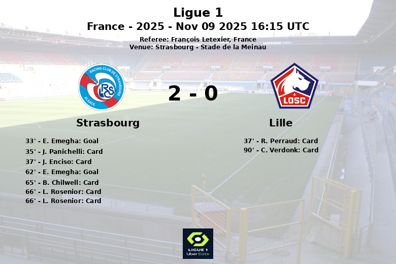Strasbourg, France – Dans un match riche en émotions et en cartons, Strasbourg a battu Lille à domicile. Le match, comptant pour la 12e journée de Ligue 1, a été marqué par une intensité au milieu de terrain et une défense solide des deux équipes.