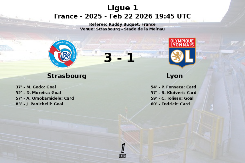 Strasbourg, France – Dans un match disputé avec des occasions pour les deux équipes, Strasbourg a décroché une victoire importante à domicile contre Lyon au Stade de la Meinau. Le match, comptant pour la 23e journée de Ligue 1 2025, s’est terminé par un score qui reflète l’intensité vécue sur le terrain.