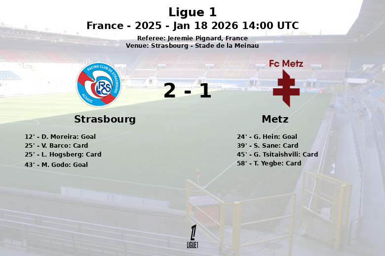 Strasbourg, France – Lors d’une rencontre palpitante de Ligue 1 qui s’est déroulée au Stade de la Meinau, Strasbourg a remporté une victoire face à Metz avec un score final de 2 à 1. Le match, comptant pour la 18ème journée de la saison régulière, a été marqué par un jeu disputé et un nombre élevé d’avertissements.