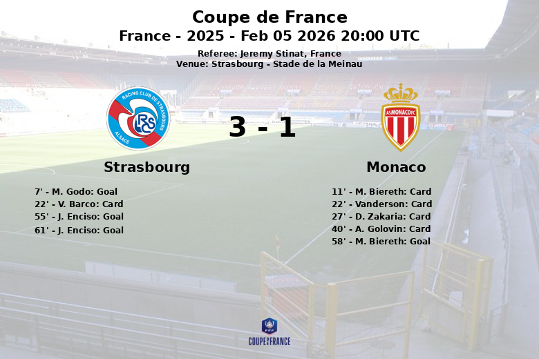 Le match s’est terminé avec 46% de possession pour Strasbourg et 54% pour Monaco. Les deux équipes ont effectué 16 tirs, mais Strasbourg a été plus efficace devant le but avec 7 tirs cadrés contre 5 pour Monaco. L’arbitre, Jeremy Stinat, a distribué un total de 5 cartons jaunes tout au long du match, reflétant l’intensité du jeu. Strasbourg se qualifie ainsi pour le prochain tour de la Coupe de France.