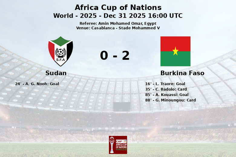 Casablanca, Maroc – Dans un match animé comptant pour la phase de groupes de la Coupe d’Afrique des Nations 2025, le Burkina Faso a vaincu le Soudan au Stade Mohammed V. La rencontre, arbitrée par Amin Mohamed Omar d’Égypte, a été marquée par des moments de haute tension et une domination alternée.