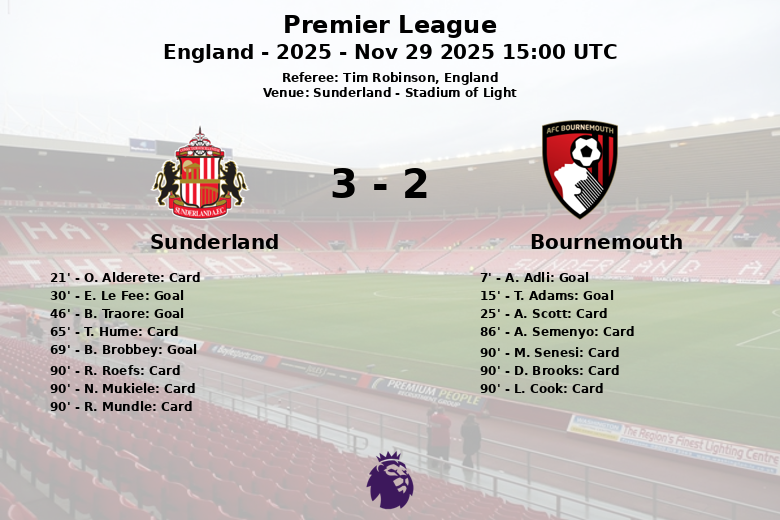 Le match a été marqué par une forte tension, reflétée dans les nombreux cartons montrés par l’arbitre Tim Robinson. Sunderland a accumulé cinq cartons jaunes (O. Alderete, T. Hume, R. Roefs, N. Mukiele et R. Mundle). Bournemouth, de son côté, a écopé de quatre cartons jaunes (A. Scott, A. Semenyo, M. Senesi, D. Brooks) et d’un carton rouge pour L. Cook à la 90ème minute.