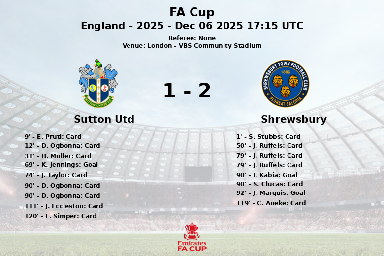 Sutton United a pris l’avantage grâce à un but de K. Jennings à la 69e minute. Cependant, Shrewsbury a réagi avec force dans les dernières minutes, égalisant à la 90e minute grâce à I. Kabia. L’excitation s’est poursuivie en prolongation, avec J. Marquis marquant le but de la victoire pour Shrewsbury à la 92e minute.