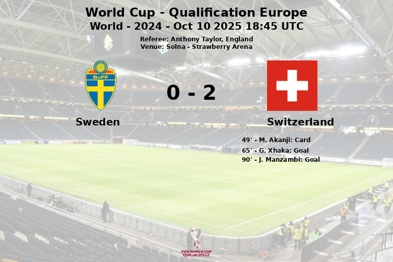 Solna, Suède – La Suisse s’est imposée face à la Suède à la Strawberry Arena lors d’un match de qualification pour la Coupe du Monde. Le match, arbitré par Anthony Taylor, a été marqué par une domination suisse dans la possession du ballon, atteignant 60% contre 40% pour la Suède.