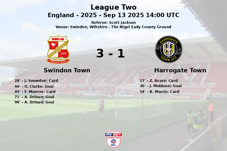 Harrogate Town a ouvert le score à la 30e minute grâce à un but de J. Muldoon, mais Swindon Town a réagi avant la mi-temps avec un but de O. Clarke à la 44e minute. En deuxième mi-temps, A. Drinan a donné l’avantage à Swindon à la 71e minute. Alors que le match semblait réglé, Drinan a de nouveau marqué à la 90e minute, scellant la victoire. Le match a connu plusieurs moments de tension, reflétés dans les cartons jaunes montrés à Z. Asare et B. Morris de Harrogate Town, et à J. Snowdon et F. Munroe de Swindon Town. Le score final était Swindon Town 3, Harrogate Town 1.