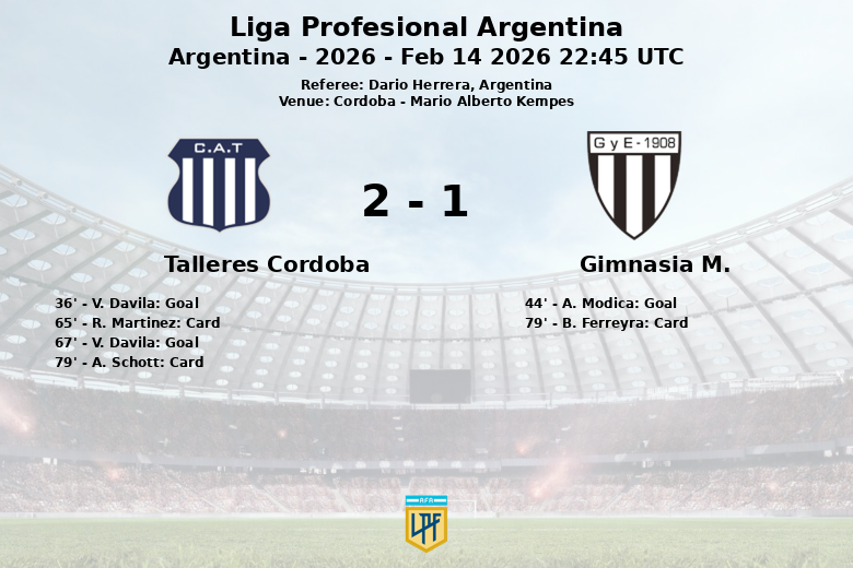 L’ouverture du score est intervenue à la 36e minute grâce à un but de Víctor Dávila, sur une passe décisive de Matías Catalán. Gimnasia a répondu avant la pause, avec un but de A. Modica à la 44e minute, suite à une passe de F. Lencioni, égalisant ainsi le score. En deuxième mi-temps, Dávila s’est de nouveau manifesté, marquant son deuxième but du match à la 67e minute, cette fois-ci sur une passe de R. Martinez, donnant ainsi l’avantage décisif à Talleres.