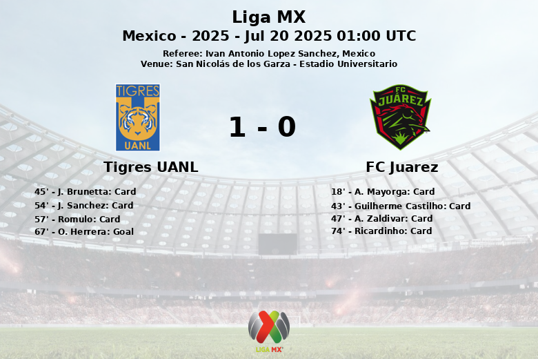 La seconde mi-temps a continué à un rythme similaire, avec l’ajout de cartons jaunes pour Zaldivar et Ricardinho pour Juárez, et Sanchez et Romulo pour Tigres. L’expulsion de Ricardinho à la 74e minute a encore compliqué les choses pour l’équipe frontalière. Finalement, à la 67e minute, Oscar Herrera a brisé l’égalité avec un but pour Tigres, sur une passe de J. Garza. Juárez, malgré ses efforts, n’a réussi à effectuer que 6 tirs, dont un seul cadré. Tigres, avec son avantage numérique et sa maîtrise du jeu, a assuré la victoire à domicile.