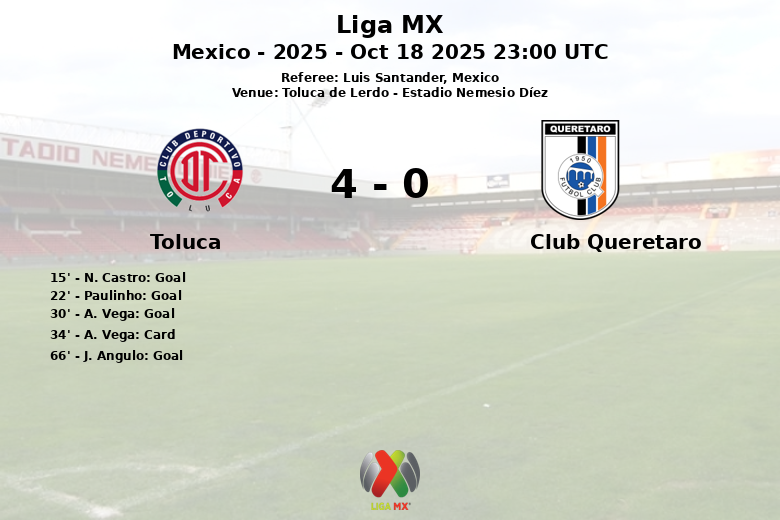 Malgré un carton jaune infligé à A. Vega à la 34e minute, Toluca a gardé le contrôle du jeu. En seconde période, J. Angulo a scellé la victoire à la 66e minute, sur une passe décisive de Paulinho. Le Club Querétaro, bien qu’il ait généré 12 tirs, n’a réussi à inquiéter le but adverse qu’à de rares occasions. Toluca a dominé les actions avec 15 tirs au total, dont 7 cadrés. Le match, comptant pour la 13e journée de l’Apertura 2025 de la Liga MX, était arbitré par Luis Santander.